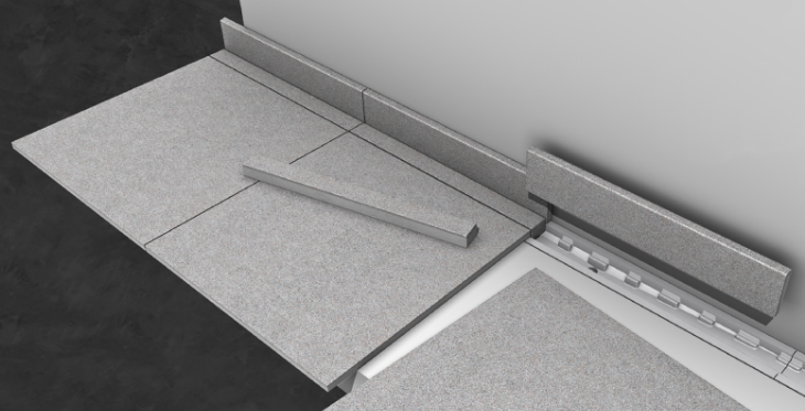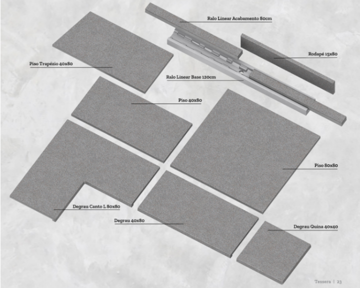 Uso em Degraus: Completando a linha do piso Granizzo, a linha possui peças de pisada de escada com medida de 40x80cm e uma peça de quina com 40x40cm para dar um perfeito acabamento no caso de cantos externos na escada.